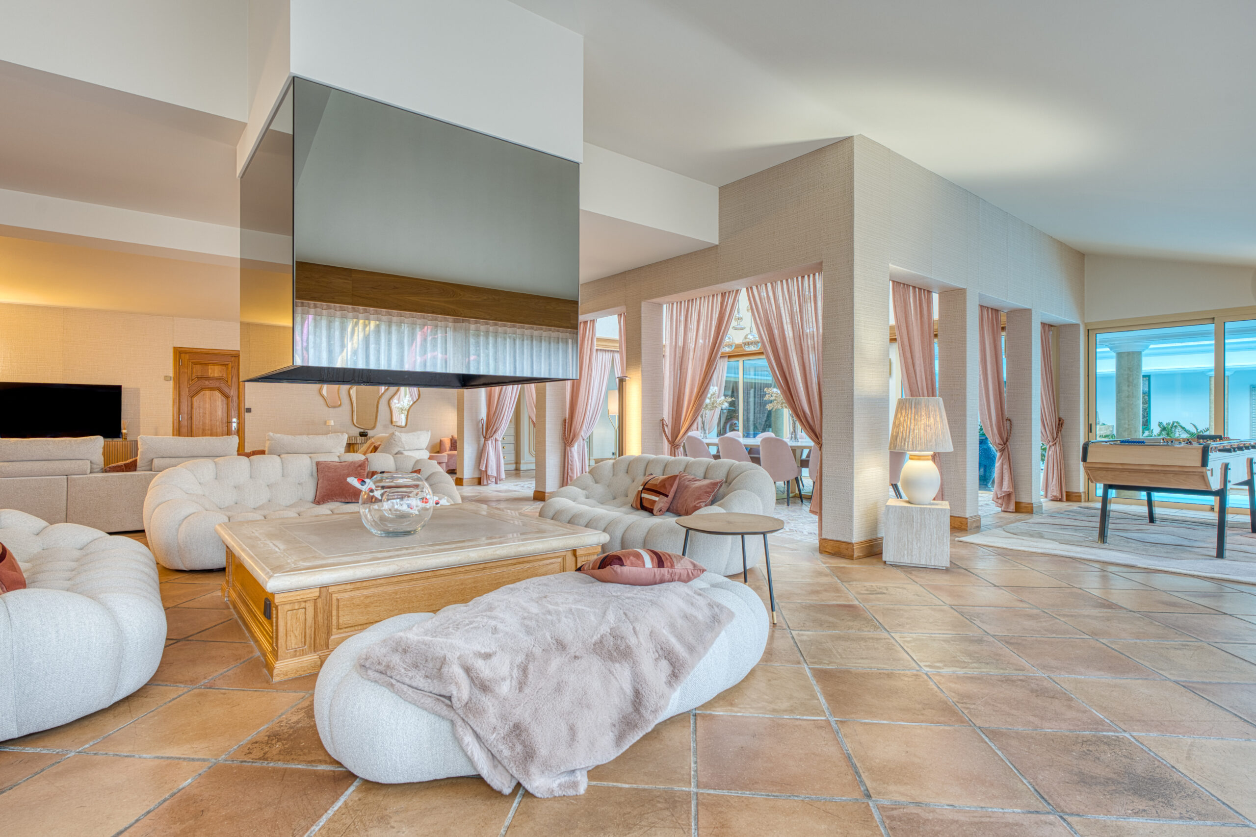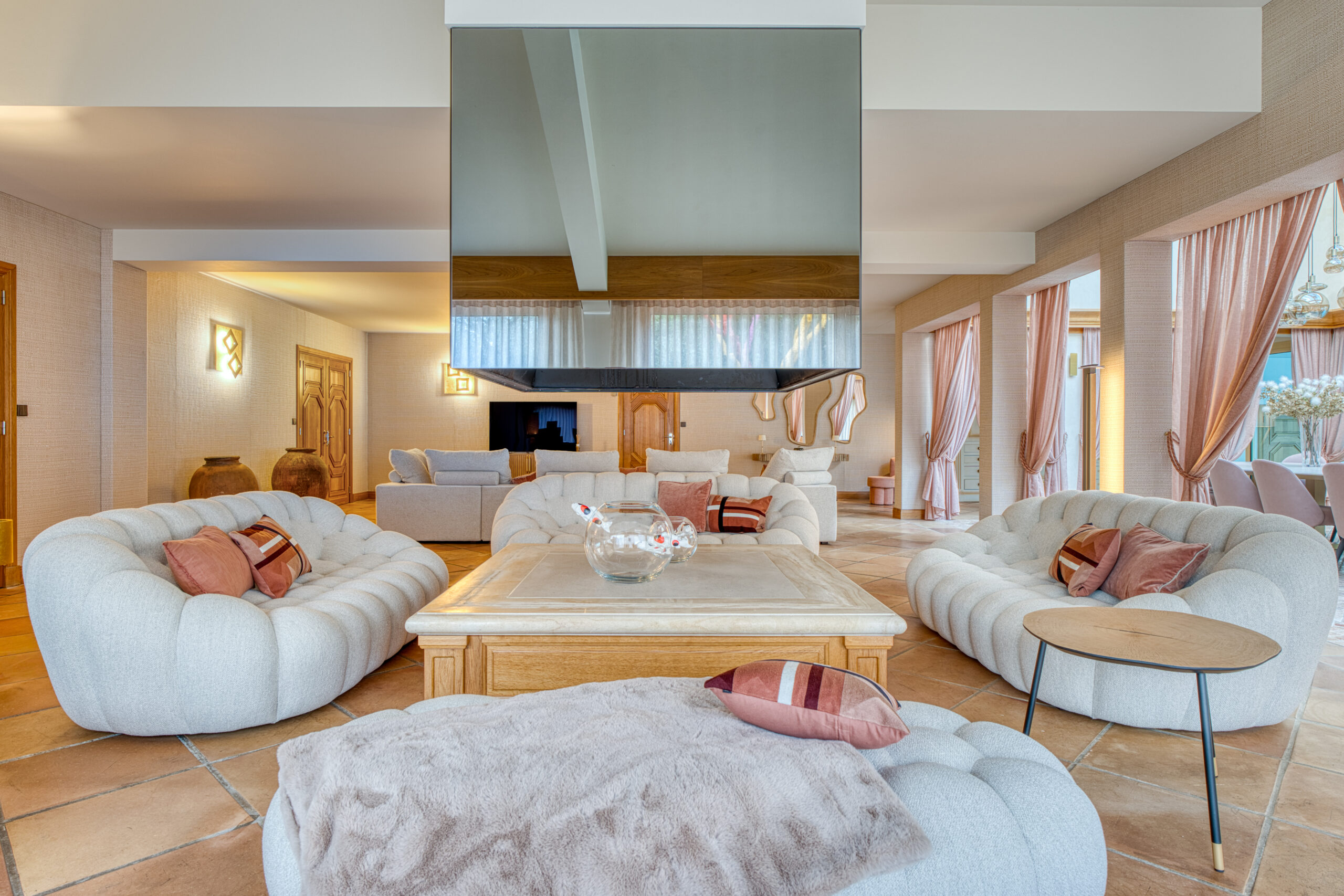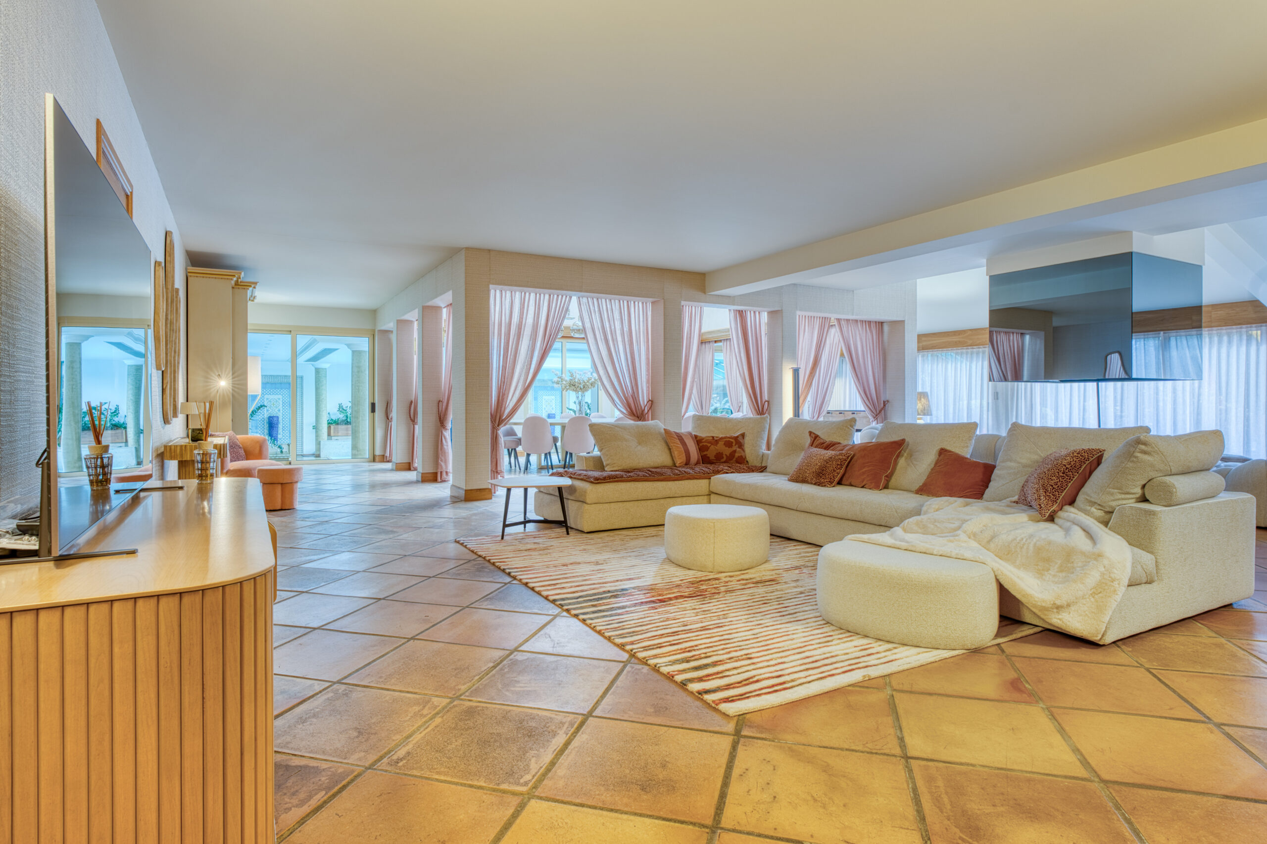 Son vaste salon invite à se retrouver : autour d’un repas, d’un souvenir, dans une atmosphère intimiste et chaleureuse. Le mobilier moderne, choisi avec élégance, dialogue avec l’architecture originelle, tandis que les grandes baies permettent de profiter pleinement du jardin paysagé avec attention. Chaque regard porté vers l’horizon rappelle la douceur des étés passés et la promesse de nouveaux moments à créer.