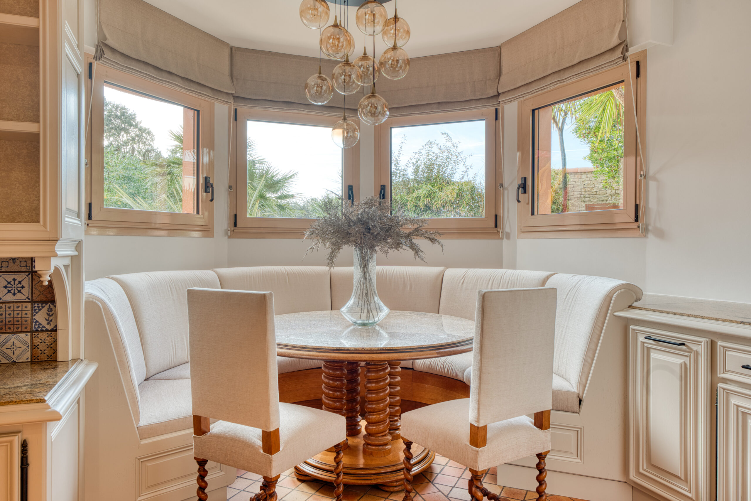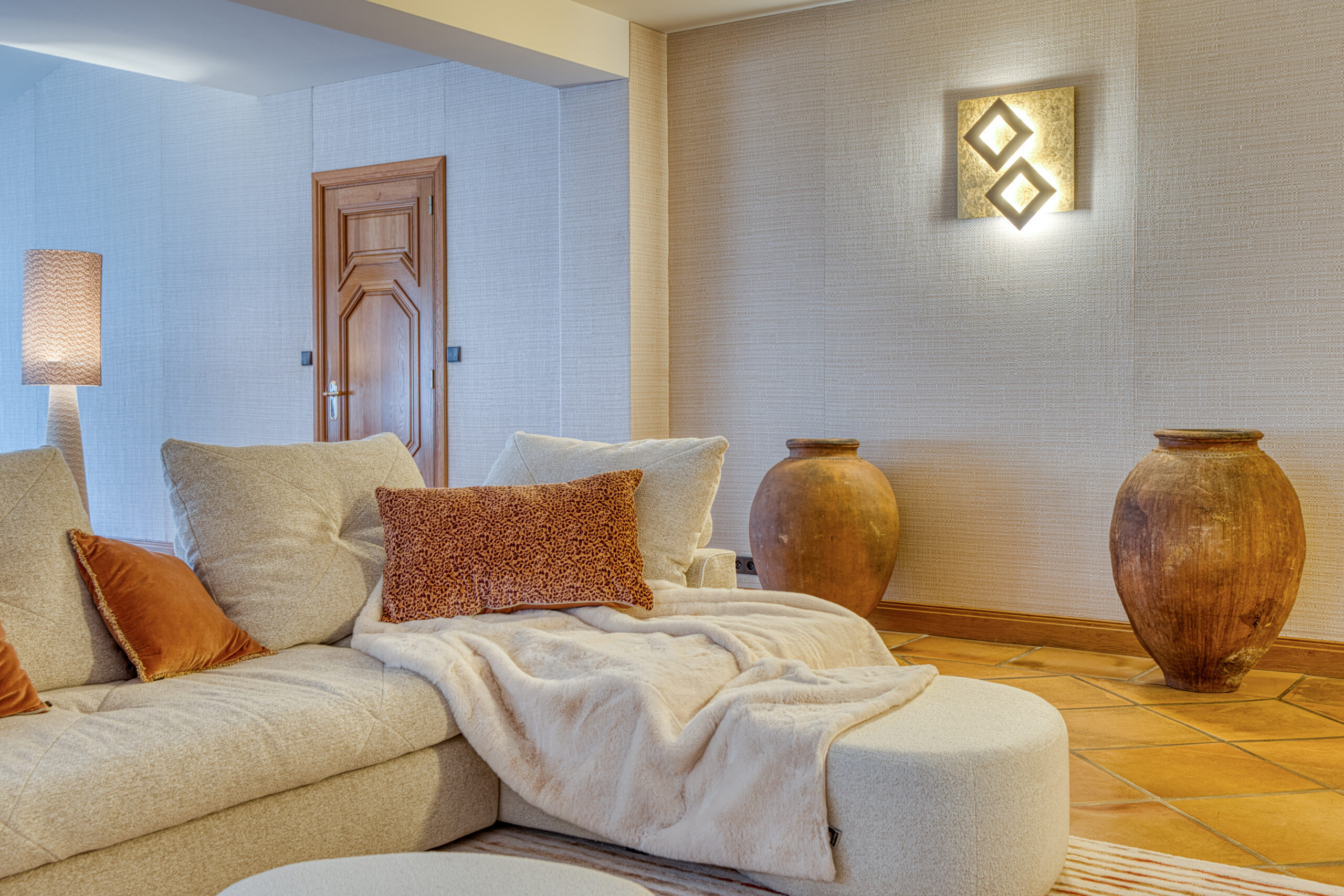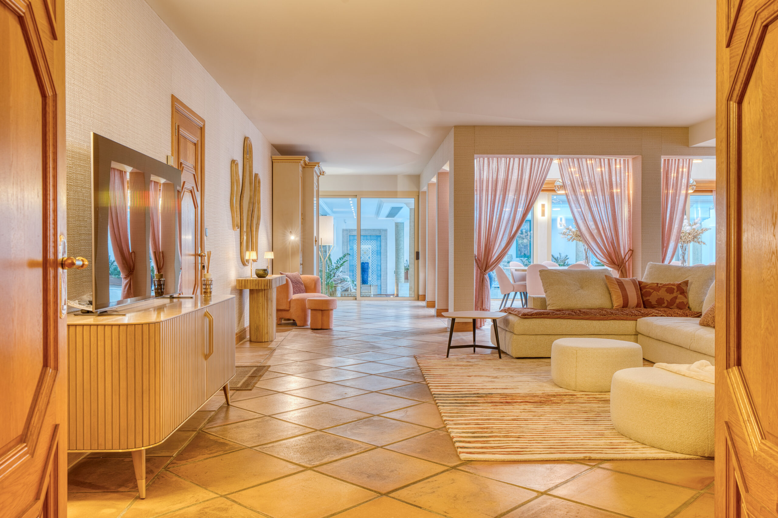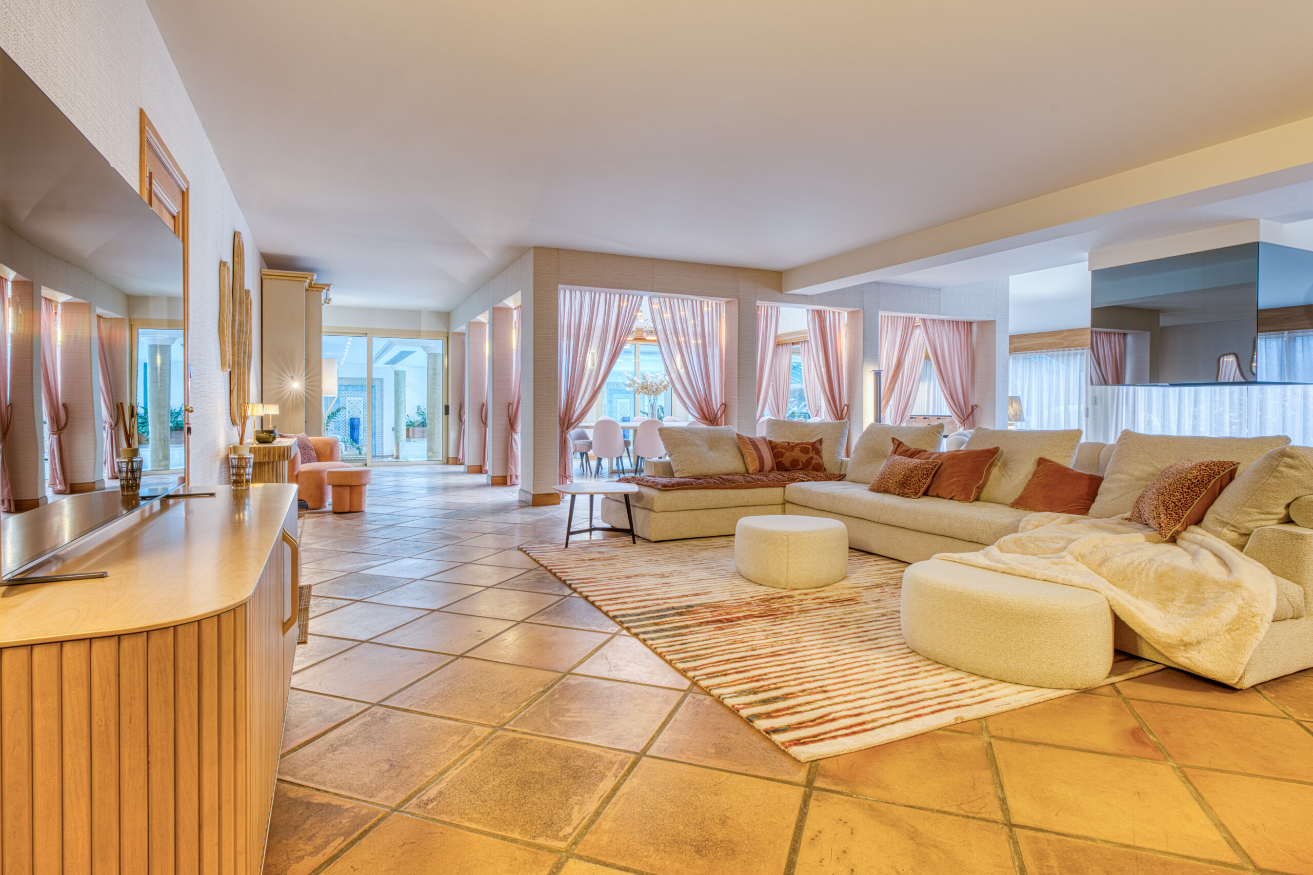 Son vaste salon invite à se retrouver : autour d’un repas, d’un souvenir, dans une atmosphère intimiste et chaleureuse. Le mobilier moderne, choisi avec élégance, dialogue avec l’architecture originelle, tandis que les grandes baies permettent de profiter pleinement du jardin paysagé avec attention. Chaque regard porté vers l’horizon rappelle la douceur des étés passés et la promesse de nouveaux moments à créer.